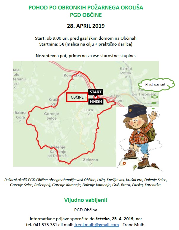 Uro pozneje se bodo po predstavitvi PGD Trebnje na pot podale še ostale pohodnice-ki, na krajšo, 8 km dolgo pot. Pri trebanjski cerkvi jih bo nagovoril trebanjski župnik Jože Pibernik s krajšo predstavitvijo cerkve in njene okolice ter z ogledom razstave v Baragovi galeriji, nato pa jih bo pot vodila od trebanjskega gradu do Vrhtrebnjega in nato do Grmade ob obronkih gozda do Male vasi in nato do cilja, kajti obe poti se bosta zaključili na Občinah, pri tamkajšnjih gasilkah in gasilcih predvidoma okrog 14. ure, kjer jih bodo postregli z malico in pijačo. Po okrepčilu pa bo sledil še krajši kulturni program in druženje.